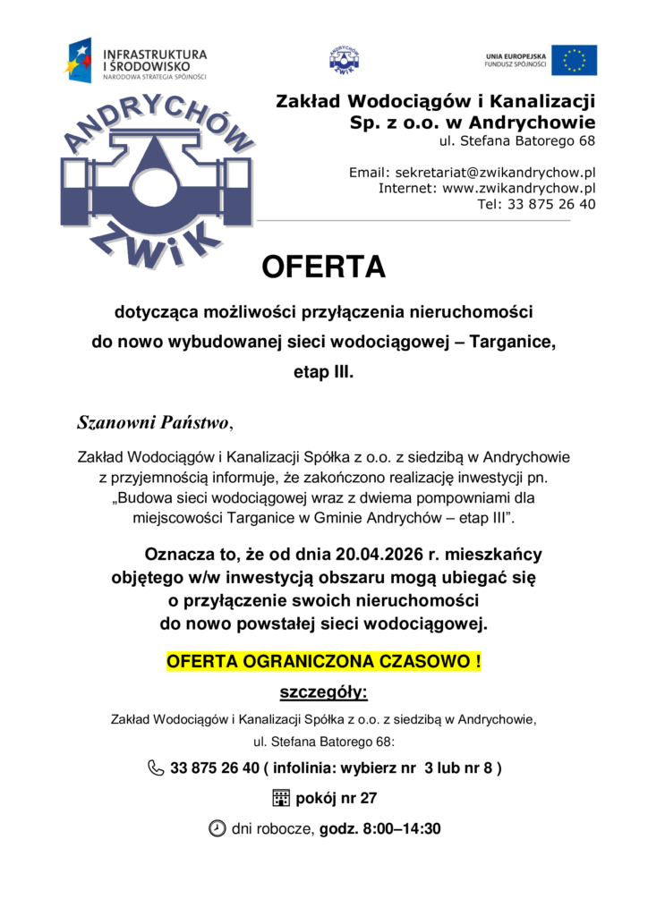 Wzmocnienie cyberbezpieczeństwa infrastruktury wodociągowej ZWIK Sp. z o.o. Andrychów Zakład Wodociągów i Kanalizacji Spółka z ograniczoną odpowiedzialnością realizuje przedsięwzięcie polegające na wzmocnieniu odporności na